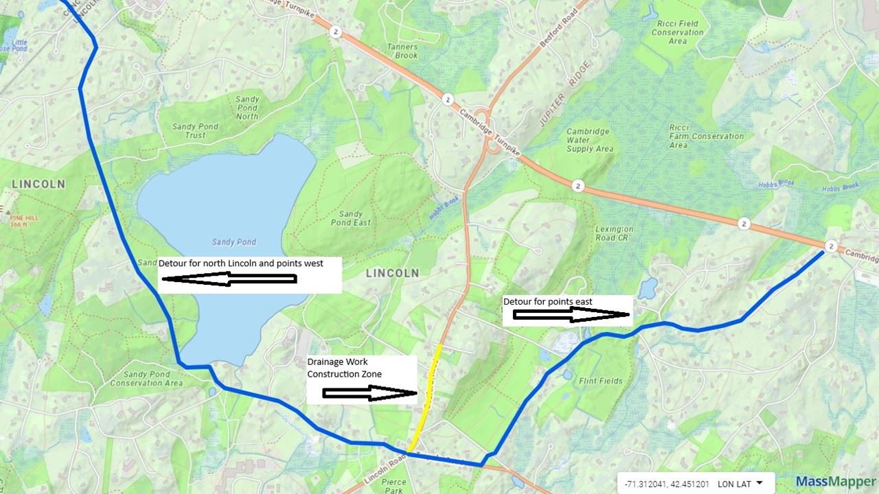 Yes. The drainage replacement work is planned for March–May 2026 and is expected to require a full roadway closure for the duration of that drainage project. Detours will be posted. Access west/north of Lincoln is expected via Sandy Pond Road and Baker Bridge Road to Route 126 and Route 2; access east of Lincoln is expected via Trapelo Road, Lexington Road, and Route 2.