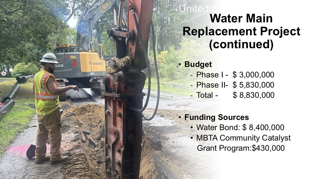- Water main project replaces about 100-year-old pipe, hydrants, and service lines to improve reliability and fire flow. Total budget: $8.83M (Phase I $3.0M; Phase II $5.83M), primarily funded by a water bond, plus an MBTA Community Catalyst grant ($430k).