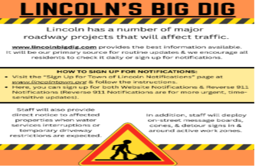 The Town plans to keep the project webpage( www.lincolnbigdig.com, or the Traffic Alert Banner on www.lincolntown.org) updated with construction impacts, detours, and weekly look-ahead information. Residents can also watch for door hangers and on-street signage in active work zones.