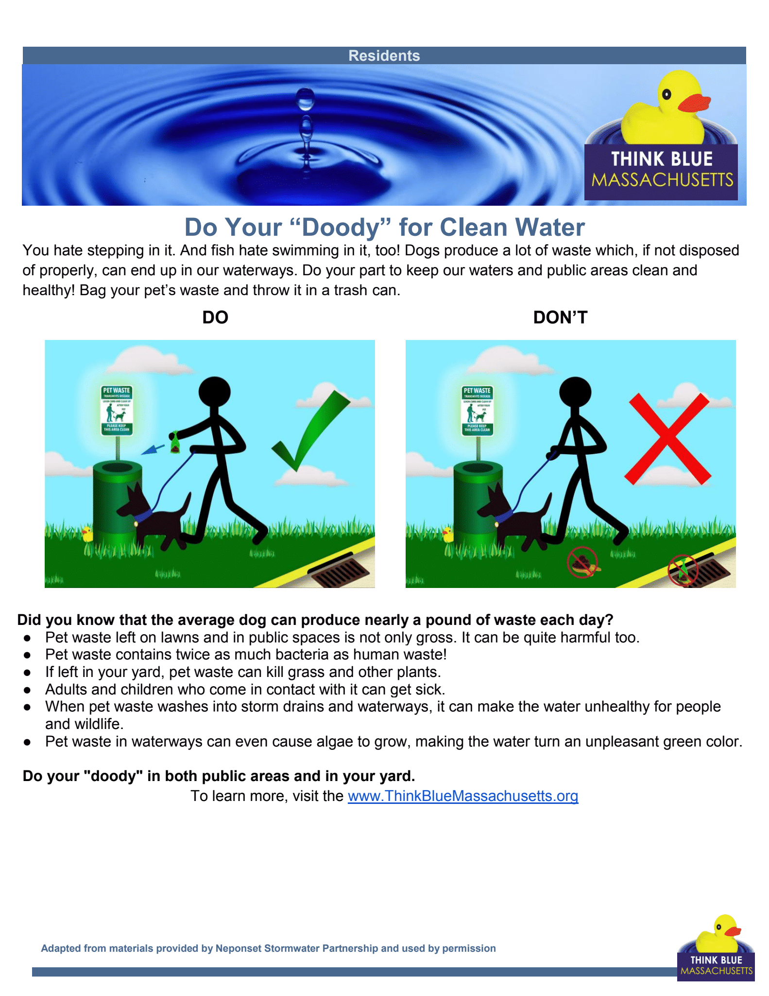 This stormwater runoff can flow directly into the Town’s street storm drain collection system, or travel overland before it empties into water bodies like a pond, stream, river, or wetland with little or no treatment to remove the pollutants that could be transporting. These are the same waterbodies we use for recreating and providing public drinking water.