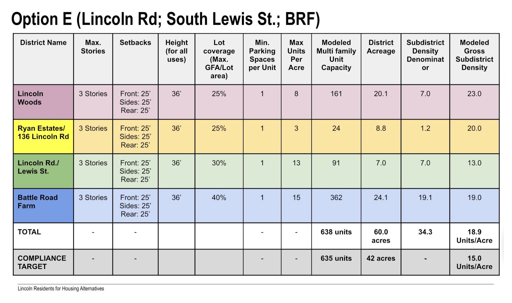 3. Correcting this discrepancy does not create any compliance issues. It has no impact on the reported number of units or acreage of the subdistricts included in Option C, but it does result in a small increase in overall density from 15.3 to 15.5.
