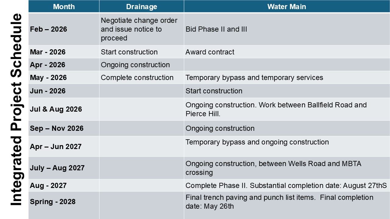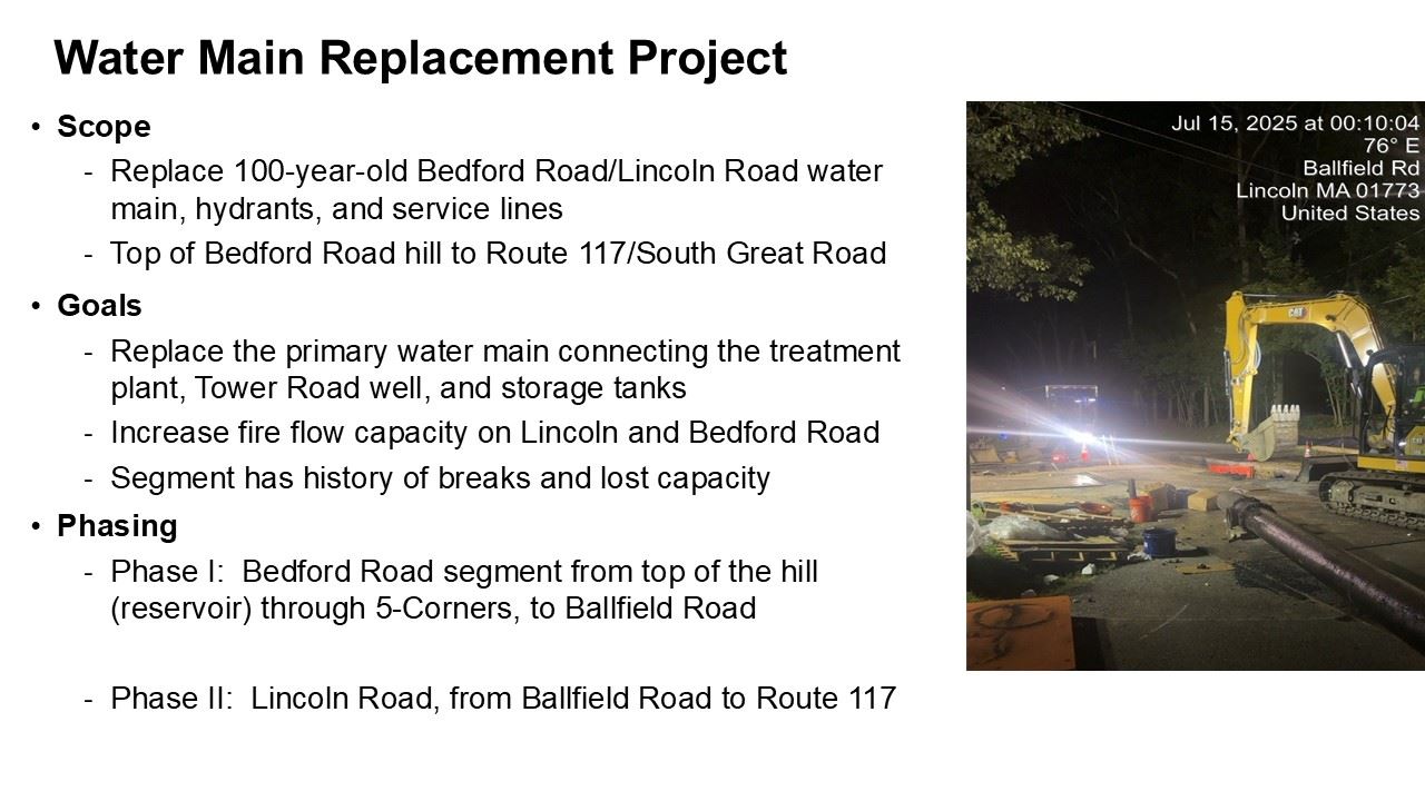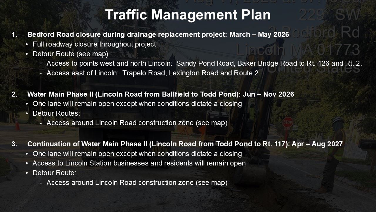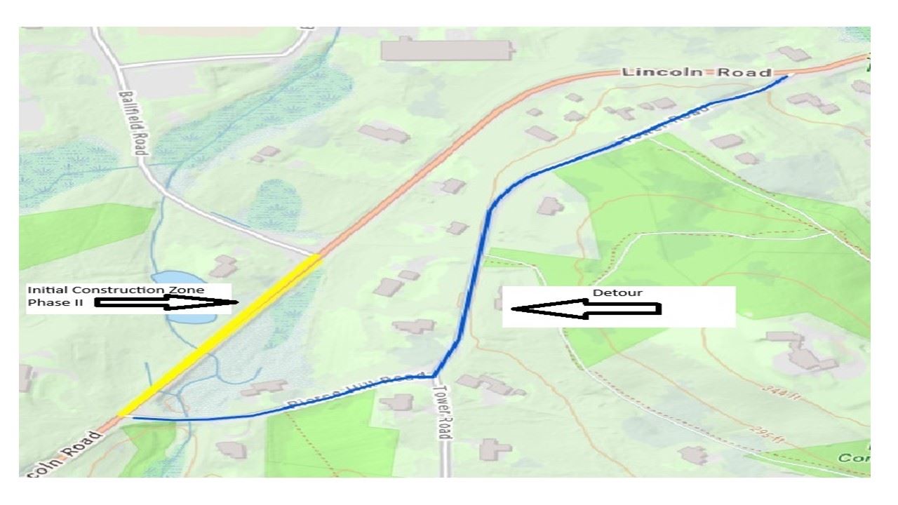 - Water Main Phase II on Lincoln Road is planned in three major seasons: June–Nov 2026 (Ballfield Road to Todd Pond) and April–Aug 2027 (Todd Pond to Route 117), with final paving and punch list work planned for spring 2028.