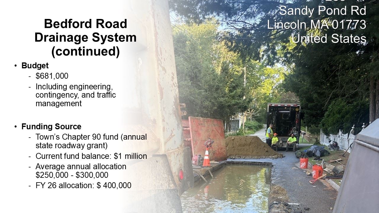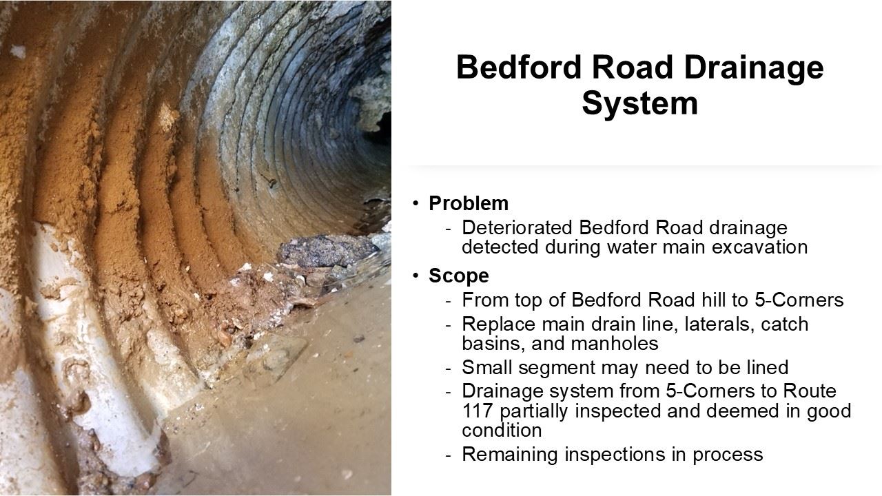 - Two related projects are happening this year: (1) Bedford Road drainage system replacement (top of Bedford Road hill to the 5-Way Intersection at the Library) and (2) water main replacement on Lincoln Road (from Ballfield Road to Route 117/South Great Road).